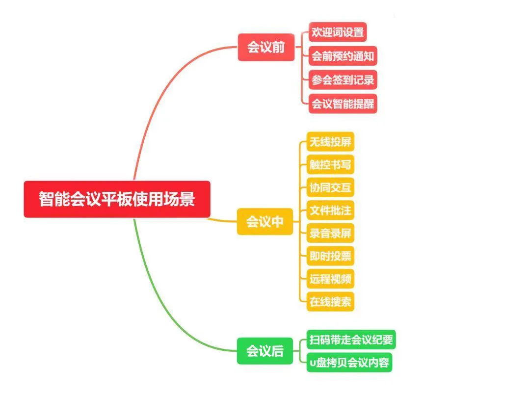在本地会议中,会议平板的作用主要替代传统的投影仪 、白板 、幕布 、电视等使用。为企业提供一屏多用的功能,提升开会效率 、提供沉浸式会议体验,可以参照以下导图大致了解其本地会议中的基本使用场景。